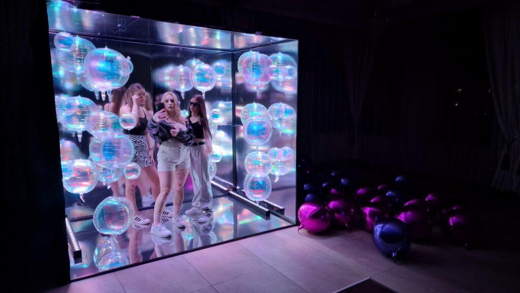 SnapBox to efektowny lustrzany box stworzony do celebracji i utrwalania momentów. Jego wymiary (prawie 2,5 metra szerokości i 1,5 metra głębokości) pozwalają na pozowanie w nim nawet kilku osób.